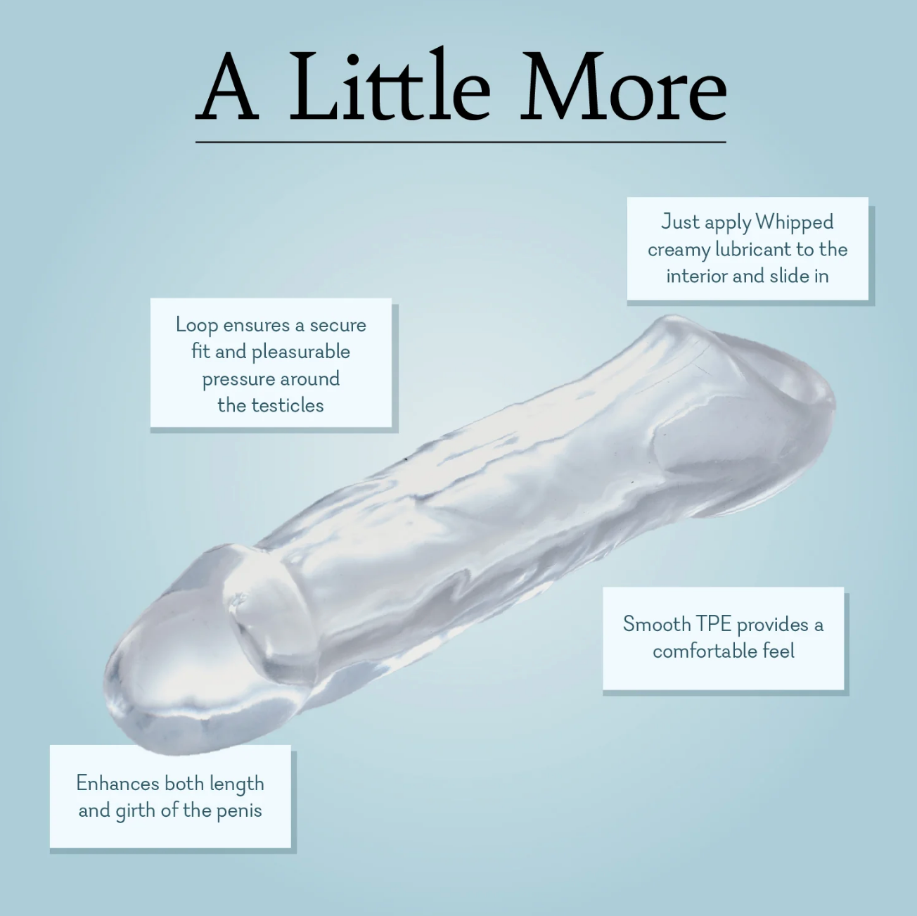 Looking for A Little More? Enhance your bedroom escapades with this 7.5" (19 cm) penis extender. Made of super soft TPE, A Little More adds both length and girth to your partner to help take things to the next level. Just apply some creamy lubricant to the interior of the toy and slide in, pulling the loop behind the testicles to keep the extender in place. After that, apply any lubricant to the exterior of the extender…and enjoy.