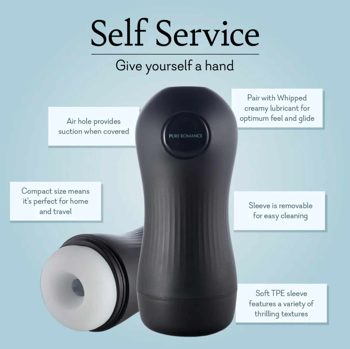 It’s time to give a hand to Self Service, our sleek and compact masturbator. Featuring a super soft sleeve and tantalizing texture, Self Service is the perfect enhancement to your solo sessions. Just apply a creamy lubricant, like Whipped, slide in, and enjoy. The included air hole provides on-demand suction for a heightened experience, and the sleeve itself is removable so it’s easy to clean and dry.